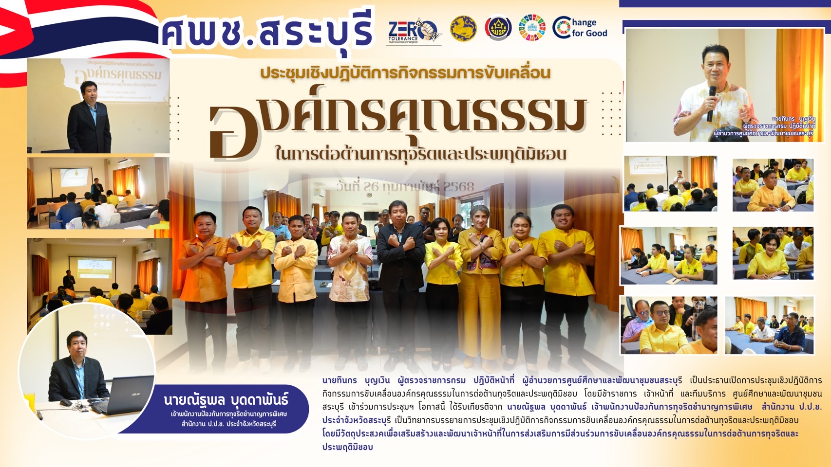 นายทินกร บุญเงิน ผู้ตรวจราชการกรม ปฏิบัติหน้าที่ ผู้อำนวยการศูนย์ศึกษาและพัฒนาชุมชนสระบุรี เป็นประธานเปิดการประชุมเชิงปฏิบัติการกิจกรรมการขับเคลื่อนองค์กรคุณธรรมในการต่อต้านทุจริตและประพฤติมิชอบ โดยมีข้าราชการ เจ้าหน้าที่ และทีมบริการ ศูนย์ศึกษาและพัฒนาชุมชนสระบุรี เข้าร่วมการประชุมฯ
