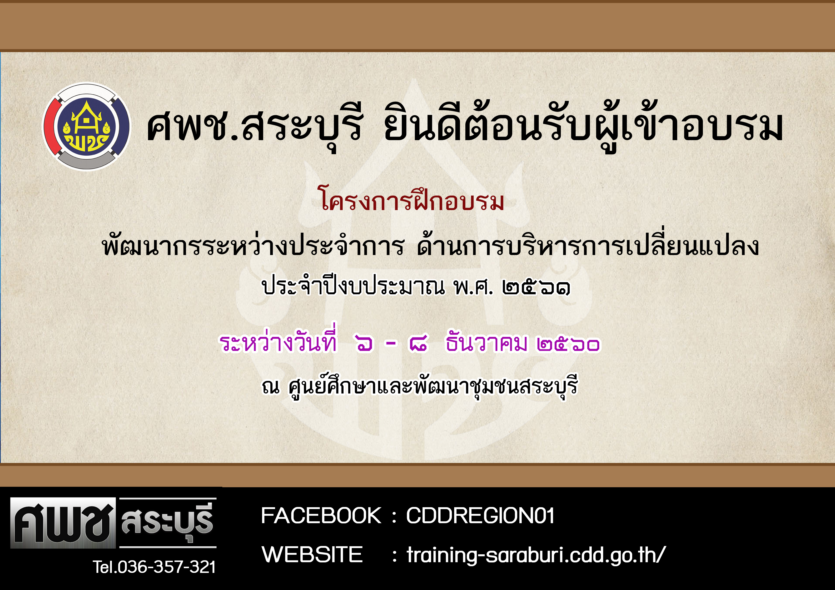 ศพช.สระบุรี ยินดีต้อนรับ ผู้เข้าอบรม ประจำปีงบประมาณ พ.ศ.2561 ระหว่างวันที่ 6-8 ธันวาคม 2560 ณ ศูนย์ศึกษาและพ้ฒนาชุมชนสระบุรี