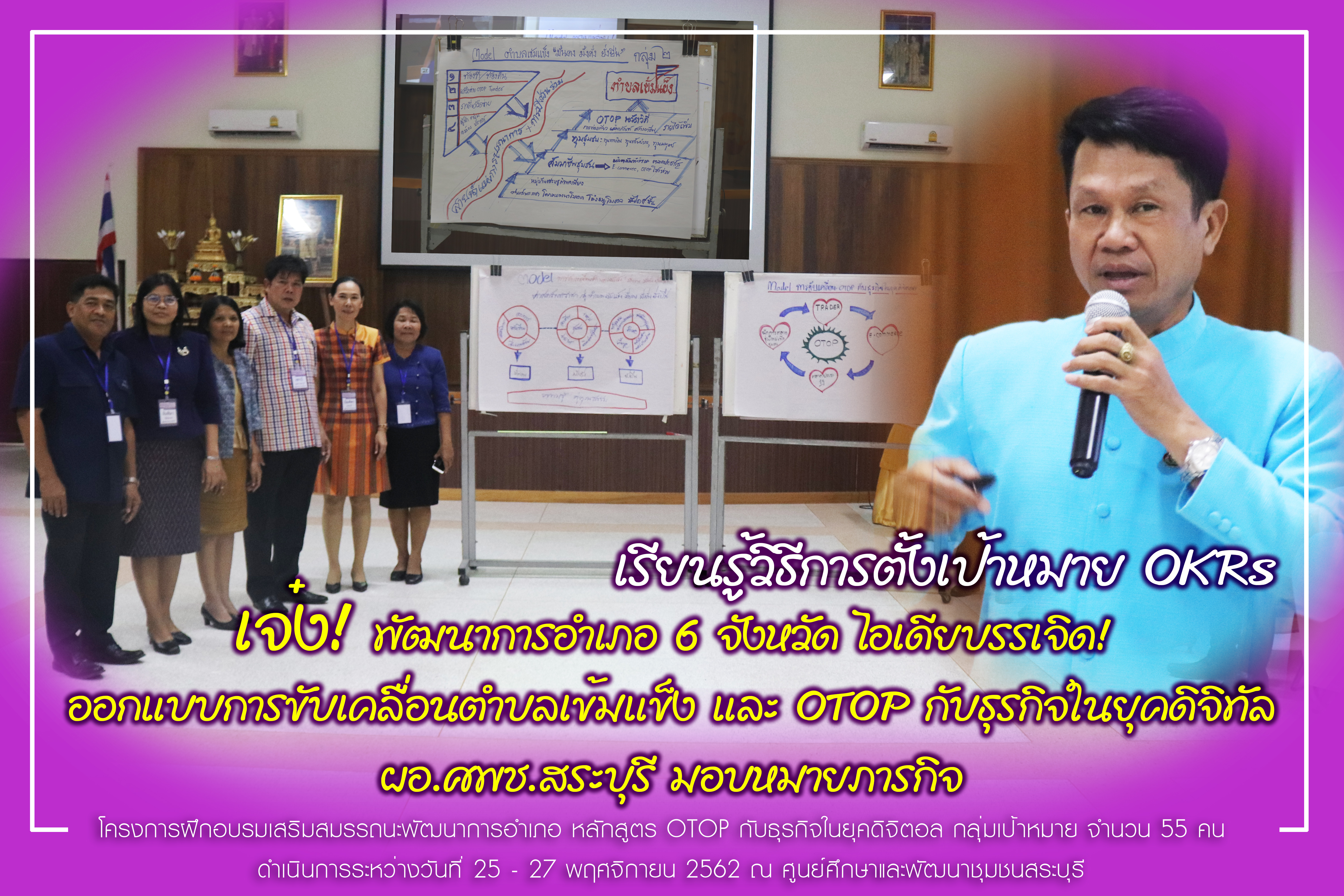 ?โครงการเสริมสมรรถนะพัฒนาการอำเภอ ?หลักสูตร OTOP กับธุรกิจในยุคดิจิตอล ?และหลักสูตร การเงิน การคลัง ประจำปี พ.ศ.2563 ดำเนินการระหว่างวันที่ 25-29 พ.ย. 62 ณ ห้องประชุมชัยพฤกษ์ ศพช.สระบุรี กลุ่มเป้าหมาย : พัฒนาการอำเภอ 6 จังหวัดภาคกลางในเขตพื้นที่บริการ จังหวัดสระบุรี ลพบุรี สิงห์บุรี สุพรรณบุรี ชัยนาท และจังหวัดอ่างทอง จำนวน 55 คน