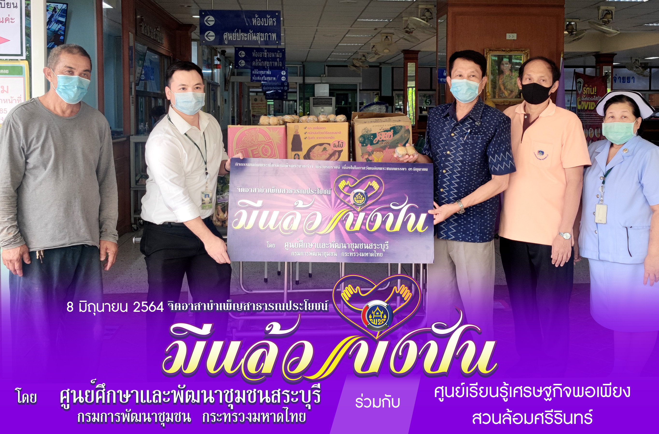 วันที่ 8 มิถุนายน 2564….นายสุรพล ท้าวพรหม ผู้อำนวยการศูนย์ศึกษาเเละพัฒนาชุมชนสระบุรี และบุคลากร ร่วมมือกับพันธมิตรเครือข่ายกสิกรรมธรรมชาติ สวนล้อมศรีรินทร์ โดยอาจารย์บุญล้อม เต้าแก้ว พร้อมสมาชิกเครือข่ายฯ เก็บเกี่ยวผลผลิตจากแปลงโคก หนอง นาโมเดล ที่ดำเนินการ ได้แก่ ผักสด ผลไม้ เครื่องแกง จำนวน 12 ถุง และแปรรูปขนม “เค้กกล้วยน้ำว้า” จำนวน 498 ชิ้น น้ำยาอเนกประสงค์ 50 ขวด สบู่ 50 ก้อน มอบให้บุคลากรทางการแพทย์และเจ้าหน้าที่โรงพยาบาลแก่งคอย และโรงพยาบาลสนามค่ายลูกเสือโป่งก้อนเส้า ตำบลท่ามะปราง อำเภอแก่งคอย จังหวัดสระบุรี ที่กำลังปฏิบัติหน้าที่ด้วยความทุ่มเท เสียสละ ในการป้องกัน ดูแลรักษา พี่น้องประชาชนให้รอดพ้นปลอดภัยจาก Covid-19 ในครั้งนี้
