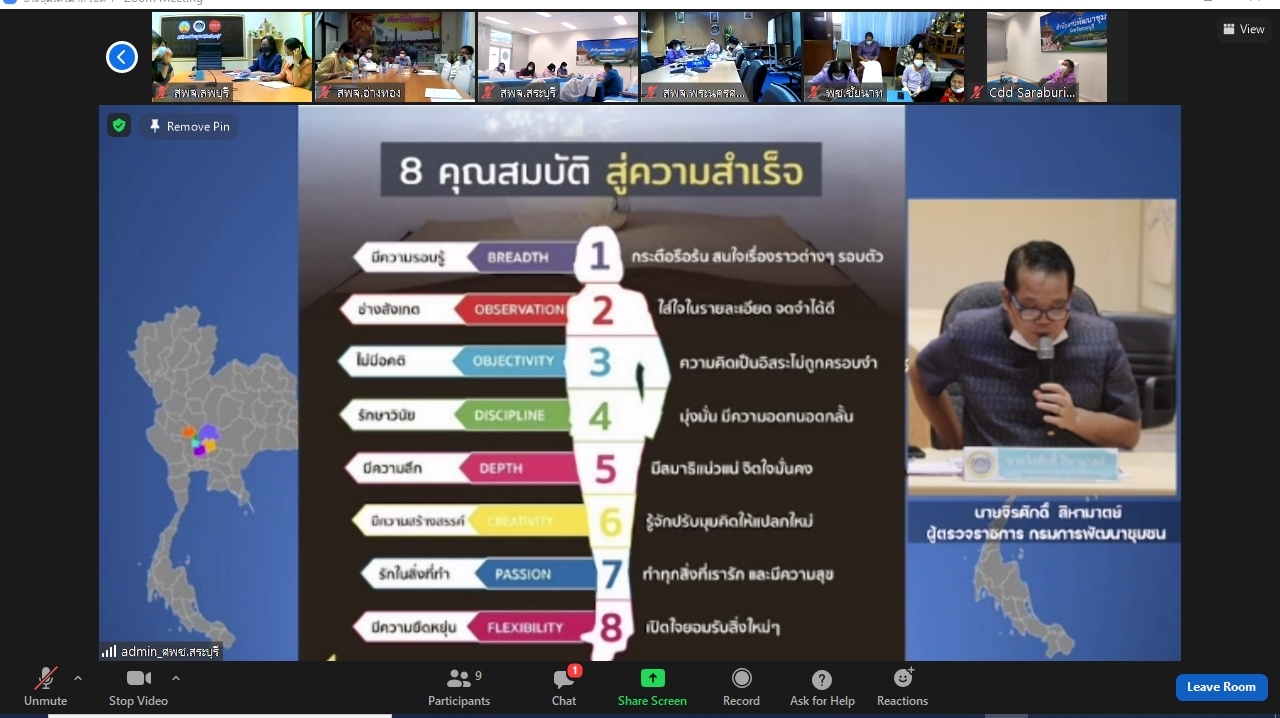 ผ่านระบบออนไลน์ (zoom cloud meeting) ดำเนินงานโดยทีมงาน ศพช.สระบุรี ณ ห้องประชุมโอทอปนวัตวิถี ศูนย์ศึกษาและพัฒนาชุมชนสระบุรี