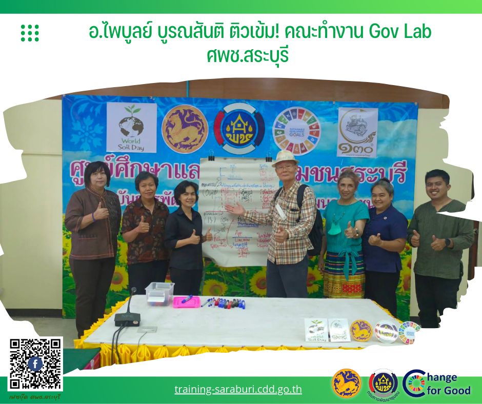 อ.ไพบูลย์ บูรณสันติ อดีตผู้ตรวจราชการกรมการพัฒนาชุมชน ผู้เชี่ยวชาญในงานพัฒนาชุมชน ติวเข้มให้ความรู้เกี่ยวกับการสร้างนวัตกรรมภาครัฐสร้างนวัตกรรมภาครัฐในงานพัฒนาชุมชน และการสร้างนวัตกรรมภาครัฐในการพัฒนาคุณภาพชีวิตของประชาชน (Government Innovation Lab : Gov Lab) กับคณะทำงานสร้างนวัตกรรมภาครัฐในการพัฒนาคุณภาพชีวิตของประชาชนฯ และบุคลากร ศพช.สระบุรี ที่มีความสนใจ โดยวันนี้ อ.ไพบูลย์ ได้ให้ข้อคิดด้านการใช้นวัตกรรม Ai มาช่วยในการสืบค้นข้อมูล และการค้นหานวัตกรรมบนพื้นฐานของงานพัฒนาชุมชน หัวใจของนวัตกรรมภาครัฐ ปัญหาที่ลูกค้าเจอและต้องการแก้ไข (Pain Point) การลงพื้นที่และการเก็บข้อมูลโดยยึดความต้องการแก้ไขปัญหาของประชาชนเป็นหลัก ด้วยหลักชุมชนเข้มแข็ง สามารถพึ่งตนเองได้ จากนั้นได้ยกตัวอย่างการดำเนินงานของบริษัท ประชารัฐรักสามัคคี สระบุรี (วิสาหกิจเพื่อสังคม) จำกัด และประสบการณ์ในงานพัฒนาชุมชนของอาจารย์ที่มีมายาวนานนับ 40 ปี ชวนน้องๆ พช. คิดคุยค้นหา สิ่งดีๆของงานพัฒนาชุมชน เพื่อได้นำความรู้ไปปรับใช้ในพื้นที่ได้