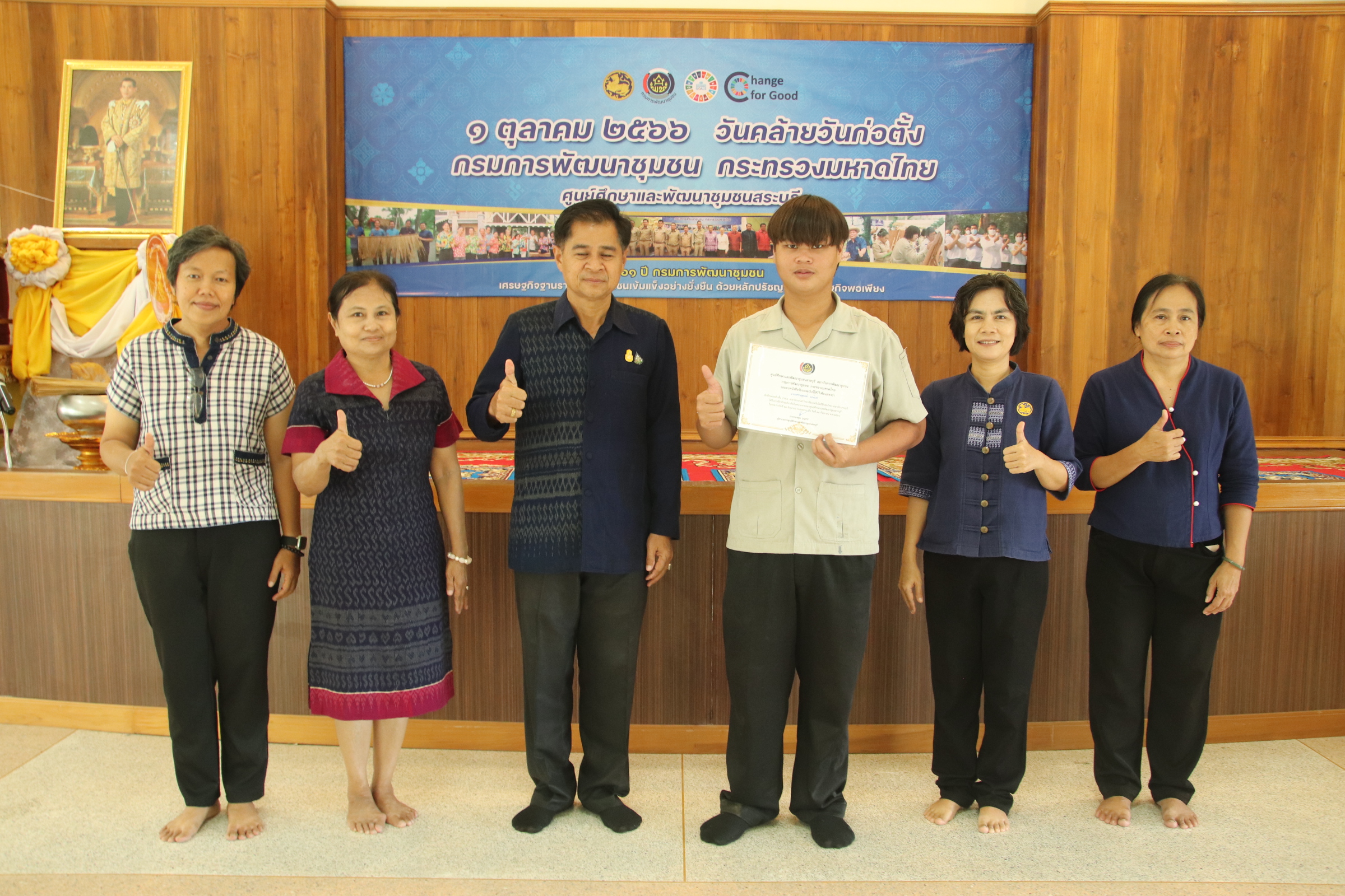 นายทองคูณ บุญศร ผู้อำนวยการศูนย์ศึกษาและพัฒนาชุมชนสระบุรี มอบหนังสือรับรองการฝึกทักษะวิชาชีพ ระหว่างวันที่ 23 มิถุนายน ถึง วันที่ 29 กันยายน 2566 ให้กับ นายเศรษฐพงศ์ วงษ์เวช นักศึกษาระดับชั้น ปวช.2 สาขาช่างยนต์ วิทยาลัยเทคโนโลยีชื่นชมไทย-เยอรมัน สระบุรี ที่ได้เข้ารับการฝึกทักษะและประสบการณ์กับพี่น้องชาวศูนย์ศึกษาและพัฒนาชุชนสระบุรี ในการนี้ ทีมงานศูนย์ศึกษาและพัฒนาชุมชนสระบุรี ฝ่ายต่างๆ ได้ร่วมกันมอบของที่ระลึกเพื่อแสดงความยินดีกับน้องเศรษฐพงศ์ด้วย