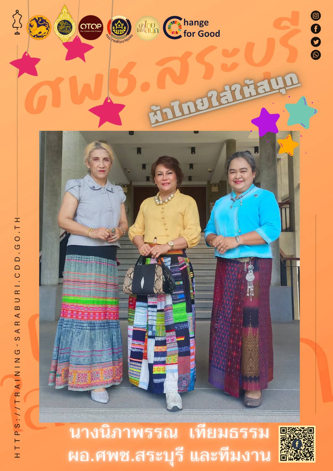 ❤️ชาว ศพช.สระบุรี “ขอเชิญชวนทุกท่าน สวมใส่ผ้าไทย” เพื่อเป็นการสืบสาน อนุรักษ์ศิลป์ ผ้าถิ่นไทย ให้ดำรงไว้ในแผ่นดิน สร้างอาชีพ สร้างรายได้ให้กับชุมชน วันนี้นำเสนอ “ผ้าไทยใส่ให้สนุก” นำทีมโดย นางนิภาพรรณ เทียมธรรม ผอ.ศูนย์ศึกษาและพัฒนาชุมชนสระบุรี และทีมงาน