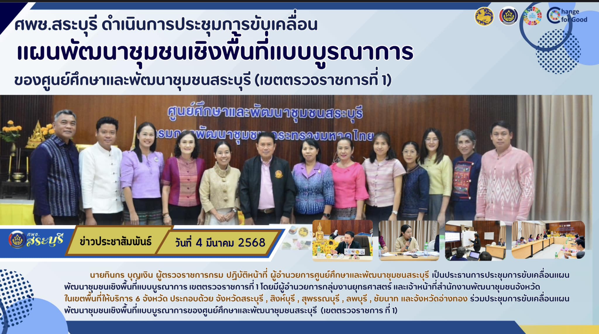 นายทินกร บุญเงิน ผู้ตรวจราชการกรม ปฏิบัติหน้าที่ ผู้อำนวยการศูนย์ศึกษาและพัฒนาชุมชนสระบุรี เป็นประธานการประชุมขับเคลื่อนแผนพัฒนาชุมชนเชิงพื้นที่ แบบบูรณาการ ในการปรับปรุง(ร่าง)แผนฯ ในส่วนของ วิสัยทัศน์ พันธกิจ ประเด็นการพัฒนา กลยุทธ์ ตัวชี้วัดเชิงยุทธศาสตร์ แนวทางการพัฒนา และแผนงาน/โครงการ ก่อนที่จะดำเนินการ รับฟังความคิดเห็นของ ผู้ที่เกี่ยวข้องต่อ(ร่าง)แผนฯ เขตตรวจราชการที่ 1 โดยมี ผู้อำนวยการกลุ่มงานยุทธศาสตร์ และเจ้าหน้าที่สำนักงานพัฒนาชุมชนจังหวัด ในเขตพื้นที่ให้บริการ 6 จังหวัด ประกอบด้วย จังหวัดสระบุรี , สิงห์บุรี ,สุพรรณบุรี ,ลพบุรี ,ชัยนาท และจังหวัดอ่างทอง ร่วมสนับสนุนข้อมูลและประชุมขับเคลื่อนแผนพัฒนาชุมชนเชิงพื้นที่แบบบูรณาการ เพื่อใช้แผนฯ ในการแสวงหางบประมาณจากจังหวัดและกลุ่มจังหวัดในด้านแผนการพัฒนาชุมชนต่อไป