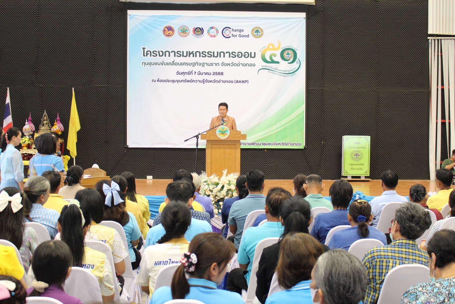 นายทินกร บุญเงิน ผู้ตรวจราชการกรมการพัฒนาชุมชน ปฏิบัติหน้าที่ผู้อำนวยการศูนย์ศึกษาและพัฒนาชุมชนสระบุรี เป็นประธานพิธีเปิดโครงการมหกรรมการออม 51 ปี ทุนชุมชนขับเคลื่อนเศรษฐกิจฐานราก ระดับภูมิภาค จังหวัดอ่างทอง ประจำปี 2568 โดยนายไชยา พิมสิงห์ พัฒนาการจังหวัดอ่างทอง กล่าวรายงานวัตถุประสงค์โครงการฯ และมีผู้แทนหัวหน้าส่วนราชการ ฯลฯ ผู้อำนวยการกลุ่มงานฯ พัฒนาการอำเภอ นักวิชาการพัฒนาชุมชน พัฒนากร อาสาพัฒนาคณะกรรมการ/สมาชิกกลุ่มออมทรัพย์เพื่อการผลิต และภาคเอกชนจำนวน 120 คน เข้าร่วมกิจกรรม