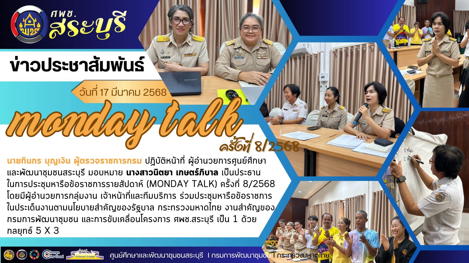 นายทินกร บุญเงิน ผู้ตรวจราชการกรม ปฏิบัติหน้าที่ ผู้อำนวยการศูนย์ศึกษาและพัฒนาชุมชนสระบุรี มอบหมาย นางสาวนิตยา เกษตร์ภิบาล เป็นประธานในการประชุมหารือข้อราชการรายสัปดาห์ (Monday Talk) ครั้งที่ 8/2568 โดยมีผู้อำนวยการกลุ่มงาน เจ้าหน้าที่และทีมบริการศูนย์ศึกษาและพัฒนาชุมชนสระบุรี ร่วมประชุมหารือ โดยมีประเด็นการประชุมดังนี้