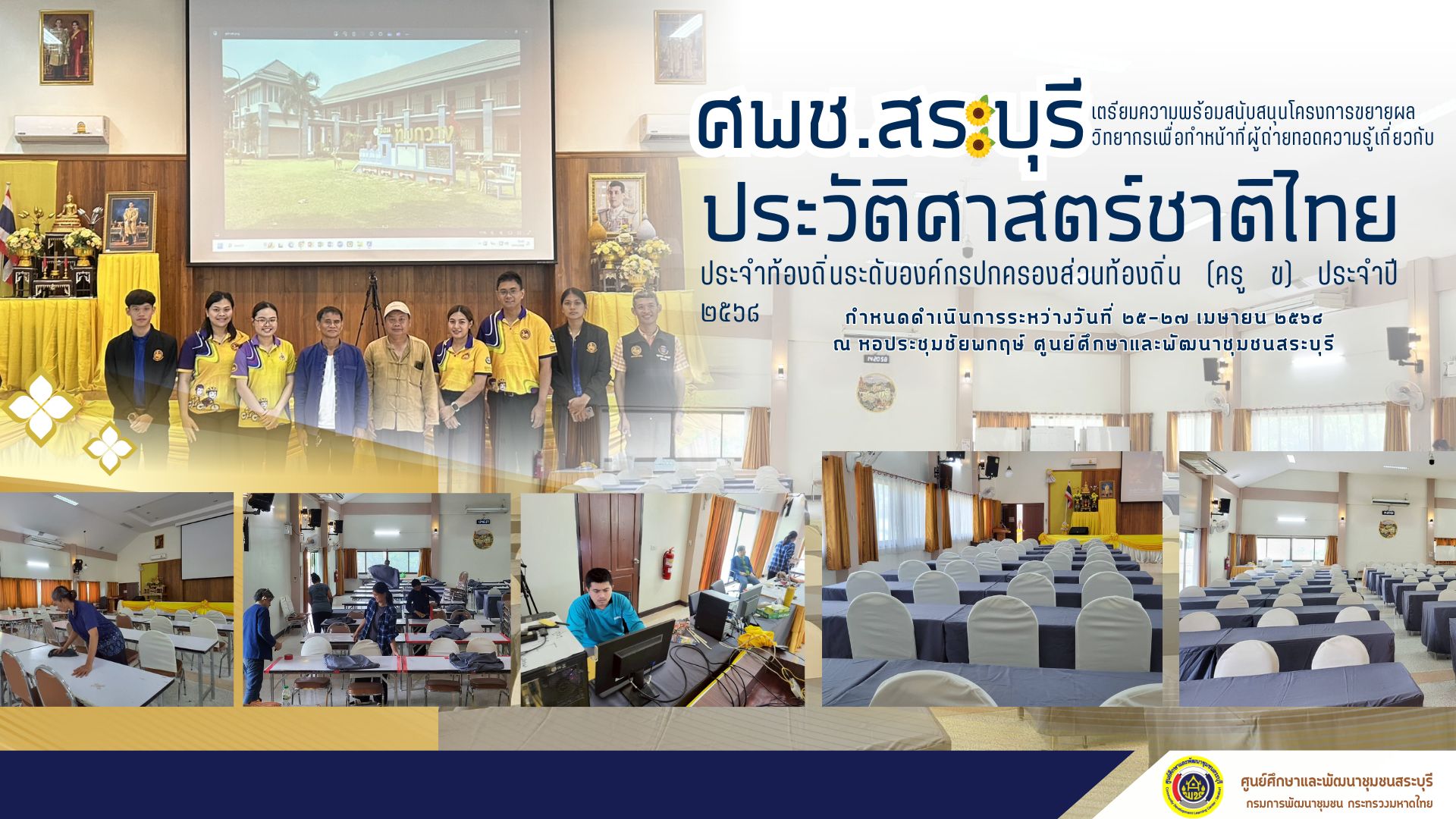 นายทินกร บุญเงิน ผู้ตรวจราชการกรม ปฏิบัติหน้าที่ ผู้อำนวยการศูนย์ศึกษาและพัฒนาชุมชนสระบุรี มอบหมายให้นายบรรลุเศรษฐ์ พึ่งงาม ผู้อำนวยการกลุ่มงานบริการทางวิชาการ พร้อมด้วยเจ้าหน้าที่ และทีมบริการศูนย์ศึกษาและพัฒนาชุมชนสระบุรี เตรียมความพร้อมด้านสถานที่การสนับสนุนการจัดโครงการขยายผลวิทยากรเพื่อทำหน้าที่ผู้ถ่ายทอดความรู้เกี่ยวกับประวัติศาสตร์ชาติไทย ประจำท้องถิ่นระดับอำเภอและระดับองค์กรปกครองส่วนท้องถิ่น (ครู ข) ประจำปีงบประมาณ พ.ศ. 2568 ดำเนินการระหว่างวันที่ 25 – 27 เมษายน 2568 โดยสำนักงานส่งเสริมการปกครองส่วนท้องถิ่นจังหวัดสระบุรี