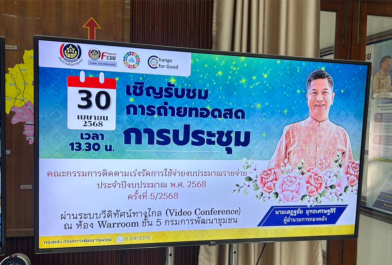 ในการนี้นายสยาม ศิริมงคล อธิบดีกรมการพัฒนาชุมชน มอบหมายให้นายเสฏฐชัย ยุทธเศรษฐสิริ ผู้อำนวยการกองคลัง เป็นประธานการประชุมคณะกรรมการติดตามเร่งรัดการใช้จ่ายงบประมาณรายจ่าย ประจำปีงบประมาณ พ.ศ.2568 ครั้งที่ 5/2568 ติดตามผลการเบิกจ่ายงบประมาณและการใช้จ่ายงบประมาณ พ.ศ.2568 ทั้งจากส่วนกลางและส่วนภูมิภาค ผ่านระบบวิดีทัศน์ทางไกล (Video Conference) ณ ห้อง War Room ชั้น 5 กรมการพัฒนาชุมชน