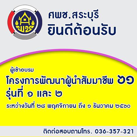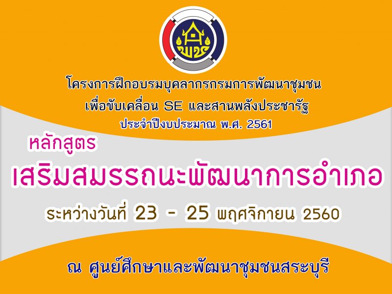 ศพช.สระบุรี ยินดีต้อนรับผู้เข้าอบรม โครงการพัฒนาบุคลากรกรมการพัฒนาชุมชน เพื่อขับเคลื่อน SE และสานพลังประชารัฐ หลักสูตรเสริมสมรรถนะ “พัฒนาการอำเภอ” ระหว่างวันที่ 23 -25 พฤศจิกายน 2560 ณ ศูนย์ศึกษาและพัฒนาชุมชนสระบุรี