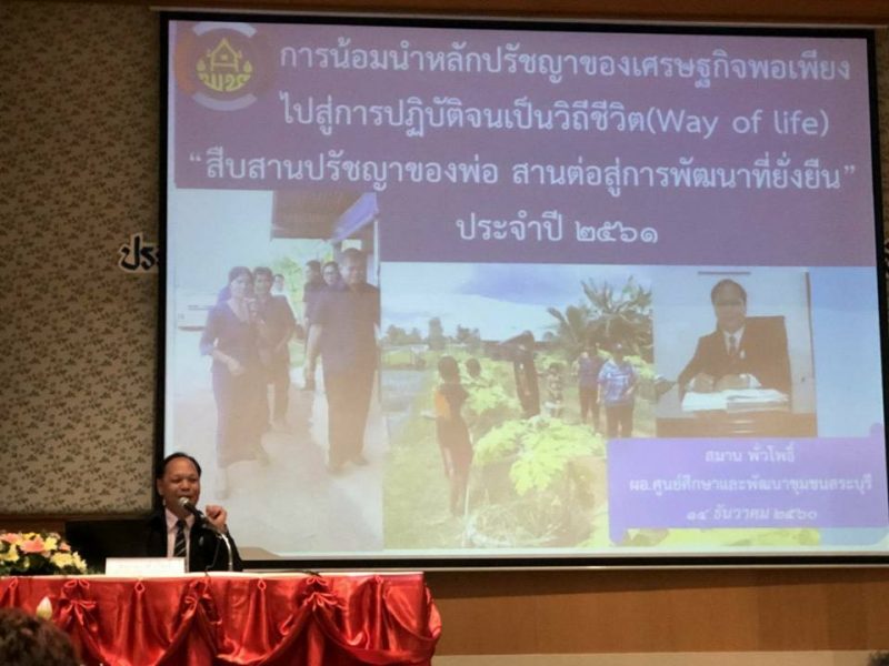 นายสมาน พั่วโพธิ์ ผอ.ศพช.สระบุรี ร่วมกับ คุณบังอร ไชยเสนา บุคคลตัวอย่าง ร่วมแลกเปลี่ยนประสบการณ์ในการขับเคลื่อนการน้อมนำหลักปรัชญาของเศรษฐกิจพอเพียงฯ